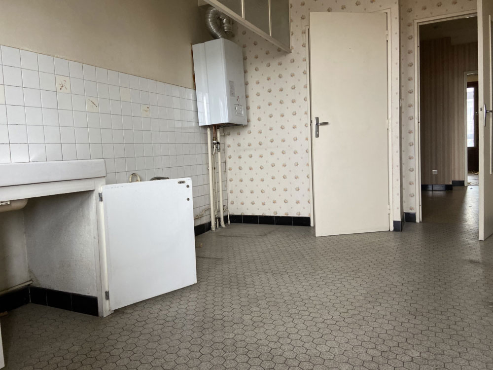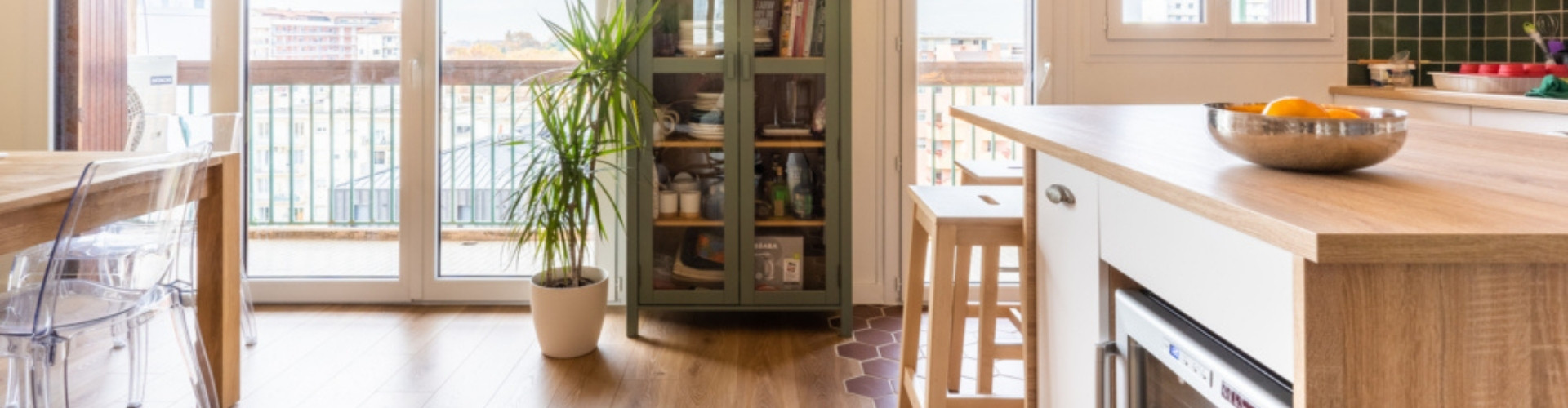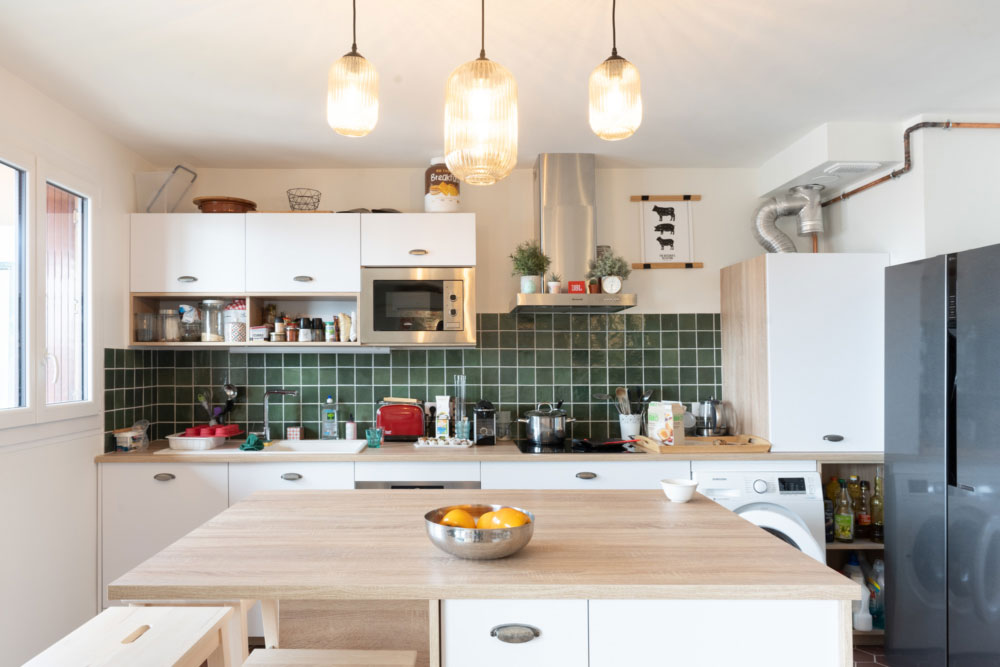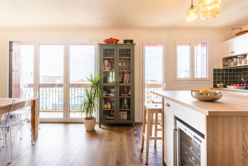 Ouverture du mur séparant la cuisine du salon pour créer un espace de vie lumineux ouvert sur l’extérieur.