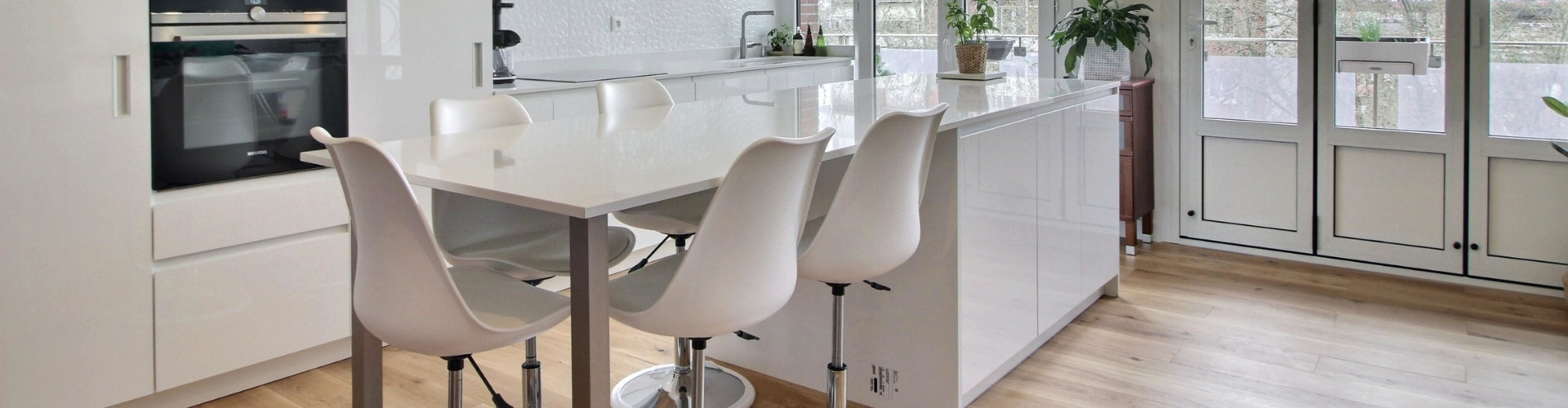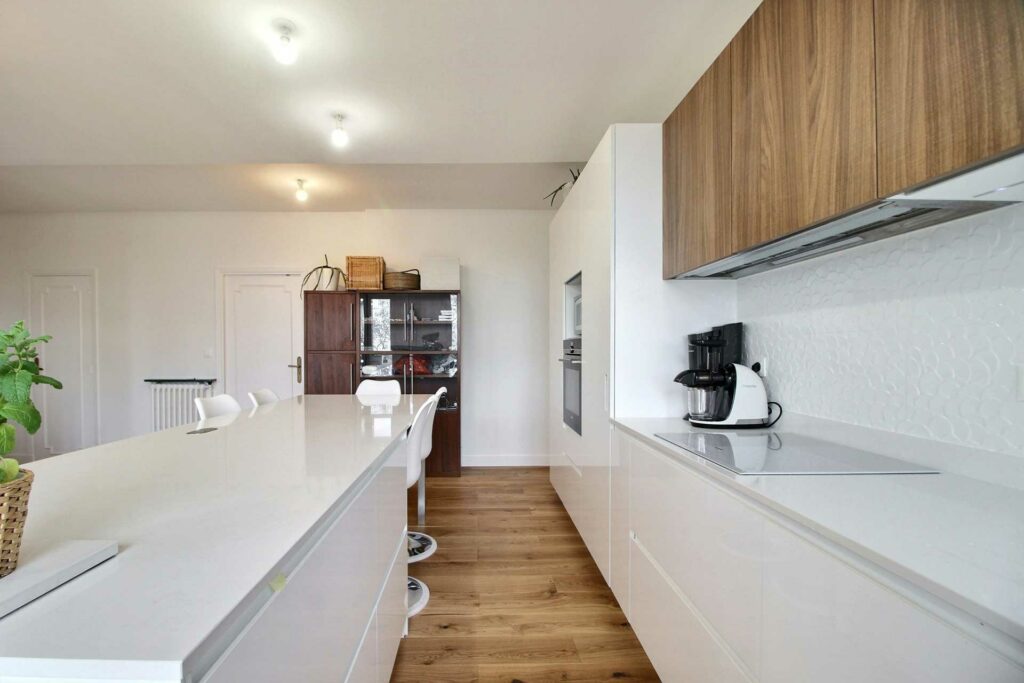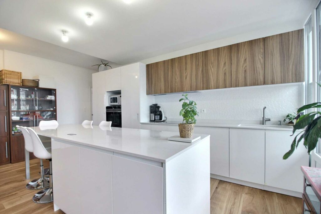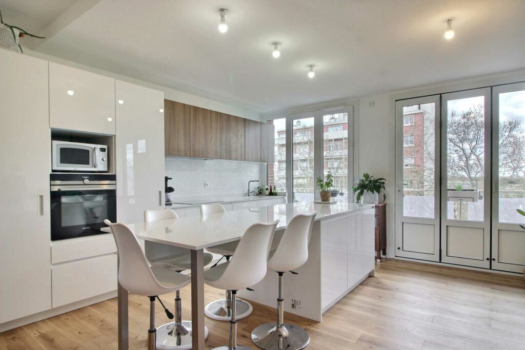 Le projet inclut une création d’une cuisine équipée sur mesure avec un plan de travail effet marbre.